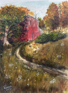 December’s AOTM is one of our newer members, Rebecca Neiss. Rebecca grew up in Northern California as part of a large, lively family, where creativity was always encouraged. During the COVID-19 pandemic, she discovered watercolor painting and quickly fell in love with the medium. What began as a casual interest blossomed into a passionate pursuit, leading her to take classes and explore her artistic voice. Today, she lives in Northern Virginia with her husband and two children, continuing to nurture her love for painting. Rebecca’s work often features landscapes, flowers, and especially old farms and homes — subjects that evoke a sense of nostalgia and quiet beauty. Her art reflects her deep appreciation for nature and history, capturing the charm of rural life with warmth and detail. Through her paintings, Rebecca shares glimpses of serenity, spirituality, and the enduring grace of the world around her.